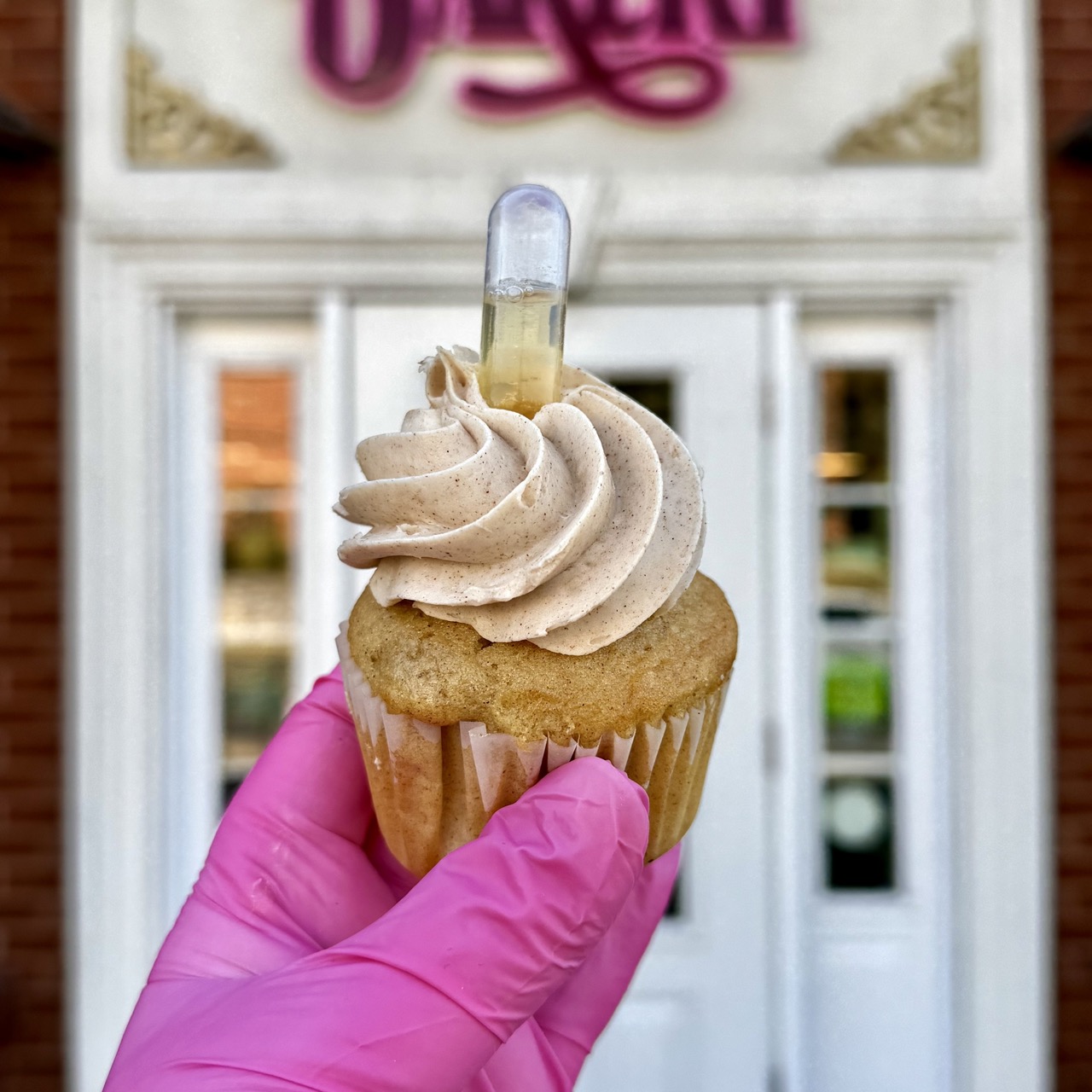 Our apple spice cake, topped with a cinnamon buttercream and garnished with a light dusting of cinnamon and a pipette filled with real apple cider from a local orchard. We suggest infusing the Apple cider into the cupcake before eating for a scrumptious and unique flavor.