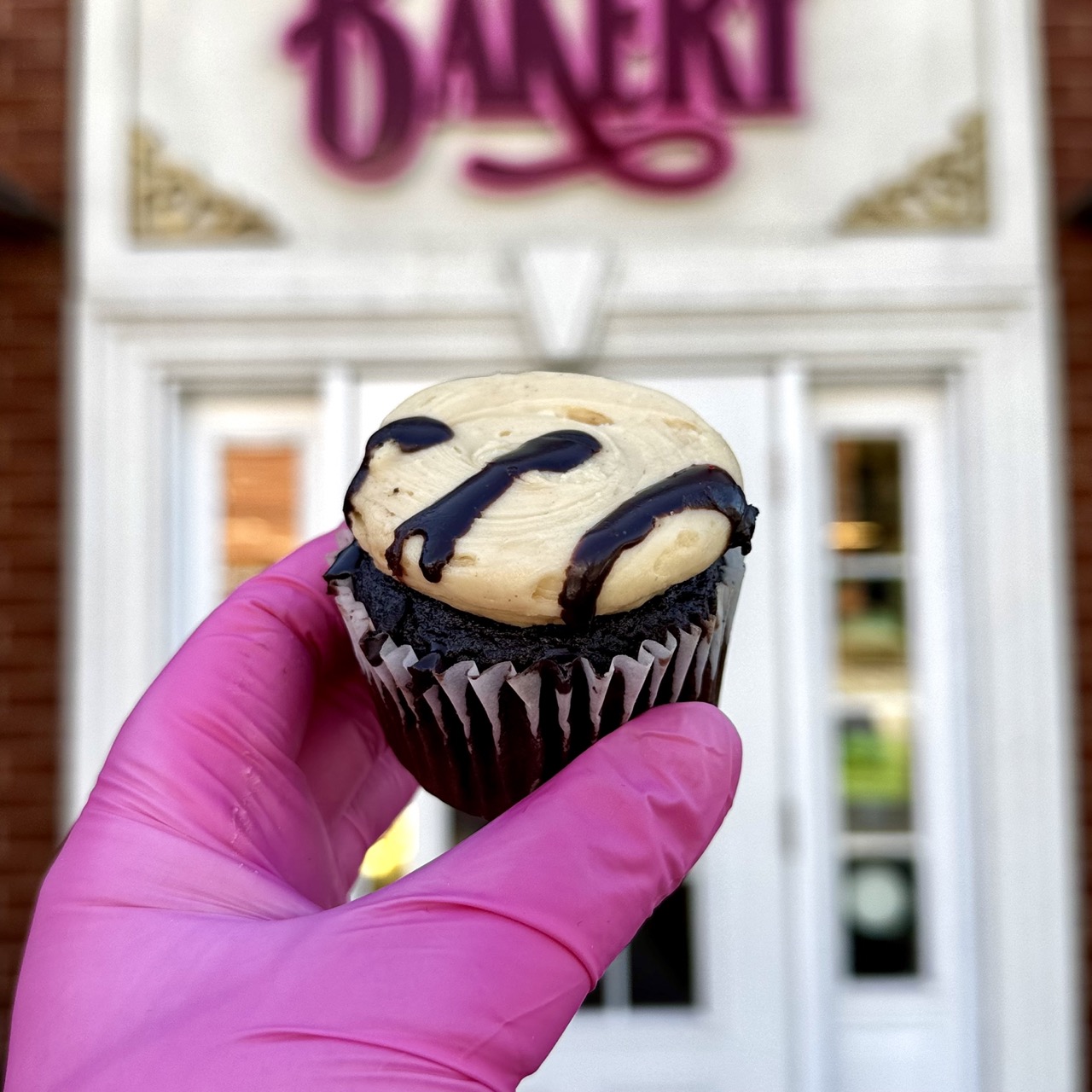 Chocolate cupcake topped with peanut butter icing and drizzled chocolate.