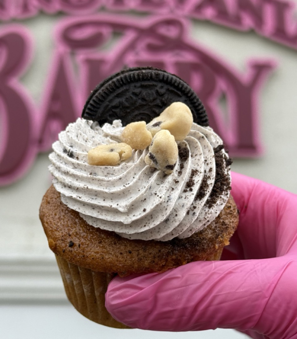 A pumpkin cake, filled with cookie dough and topped with Oreo Buttercream, Oreo crumbs, and cookie dough pieces.