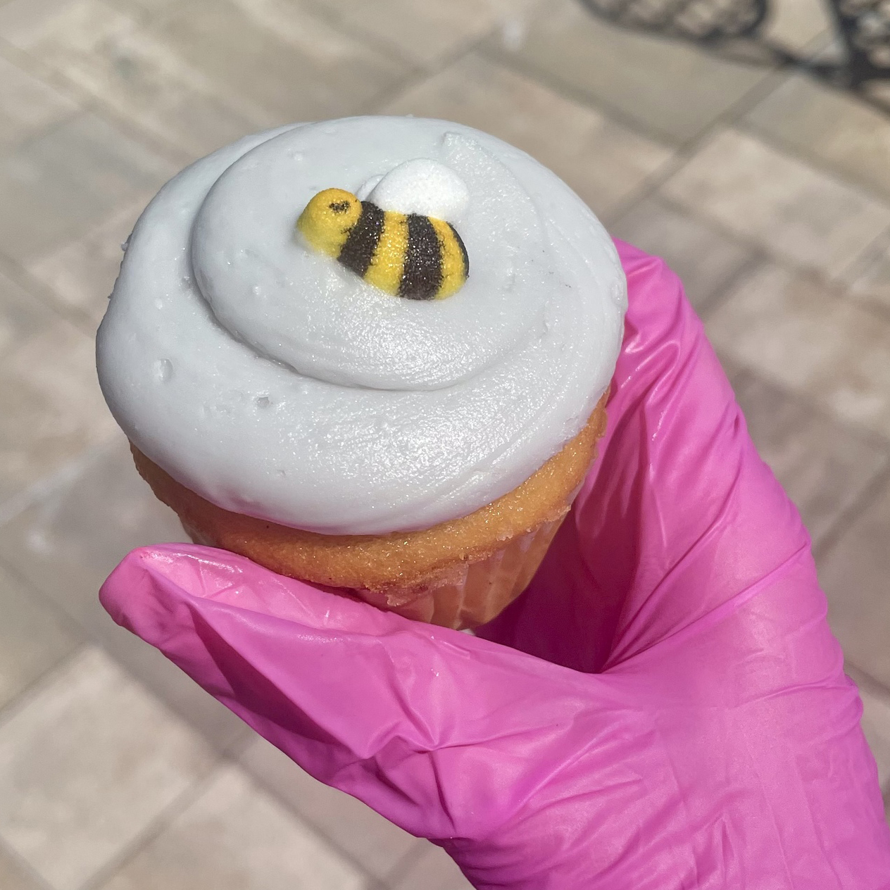 A honey cake, topped with a lavender flavored French buttercream, & finished off with a little sugar bee.