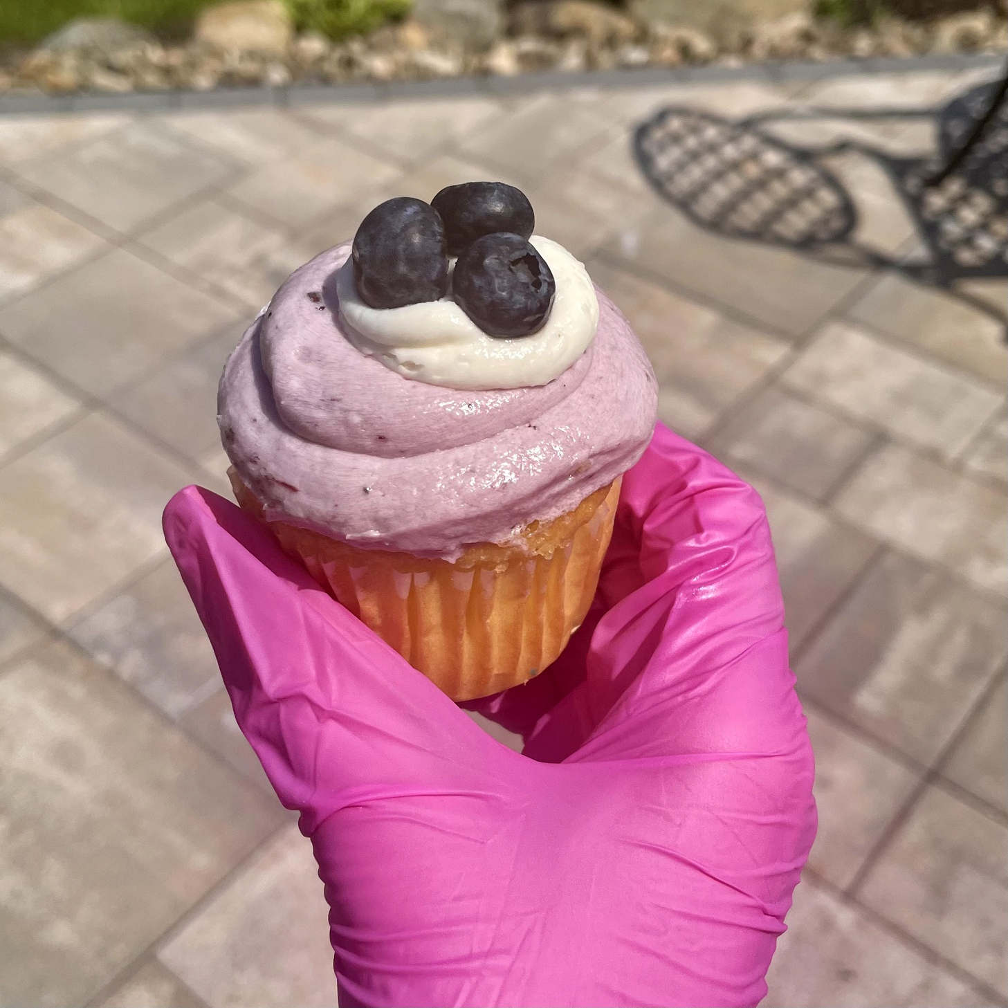 A lemon cupcake iced with a blueberry buttercream and topped with a dollop of blueberry filling. A delicious and refreshing summer flavor!