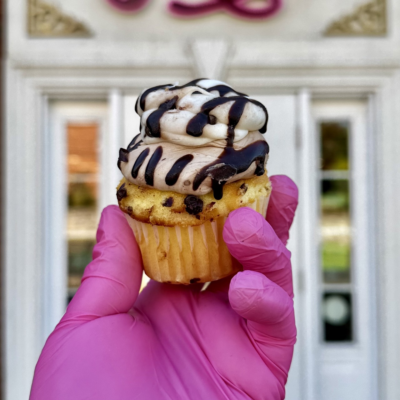 A chocolate chip cake, topped with a swirl of nutella buttercream, rolled in cookie crumbs, & then topped with a dollops of cookie dough & a drizzle of chocolate.