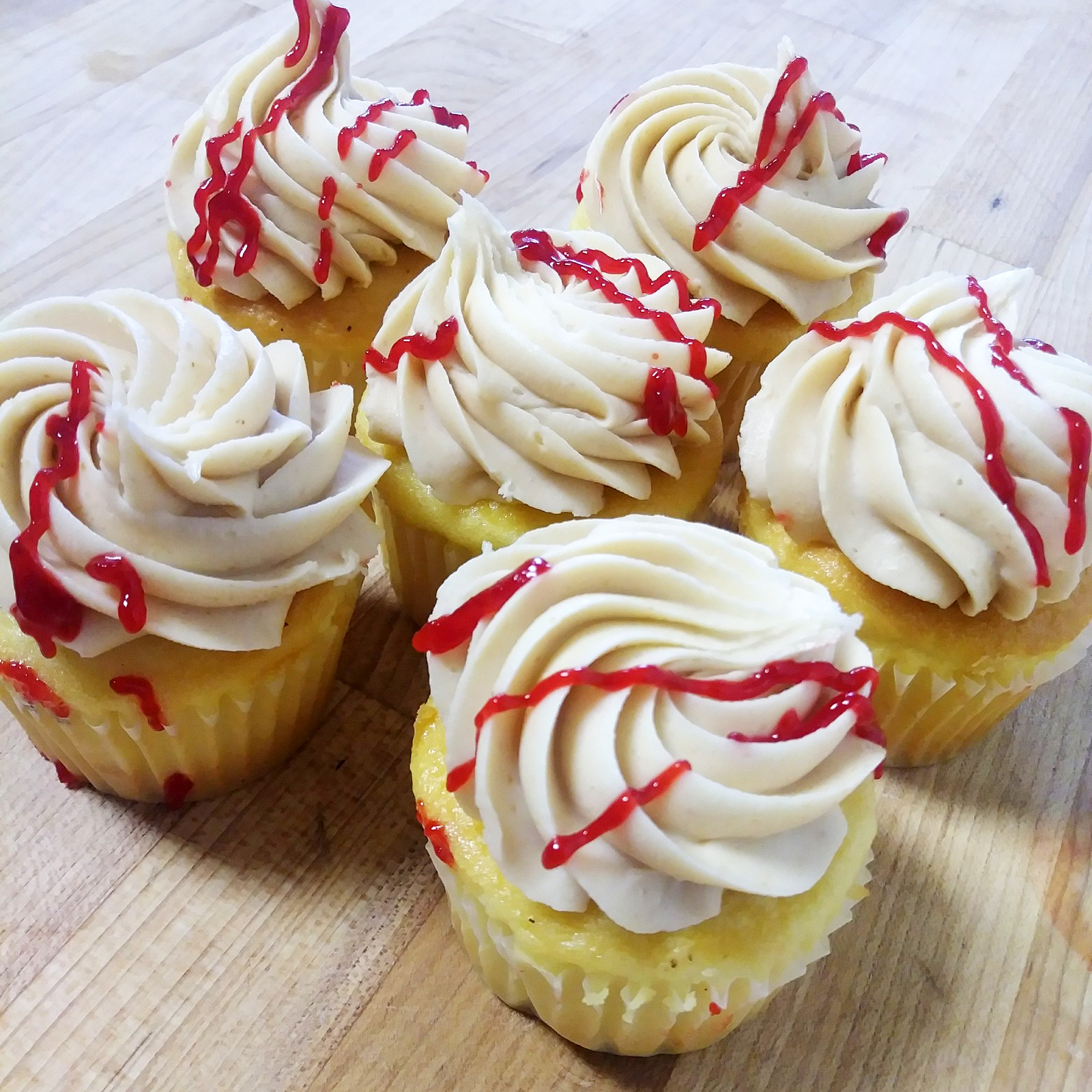 Our moist vanilla cake filled with jelly, iced with peanut butter buttercream and topped with a drizzle of jelly. One of our August Cupcakes of the Month! :)