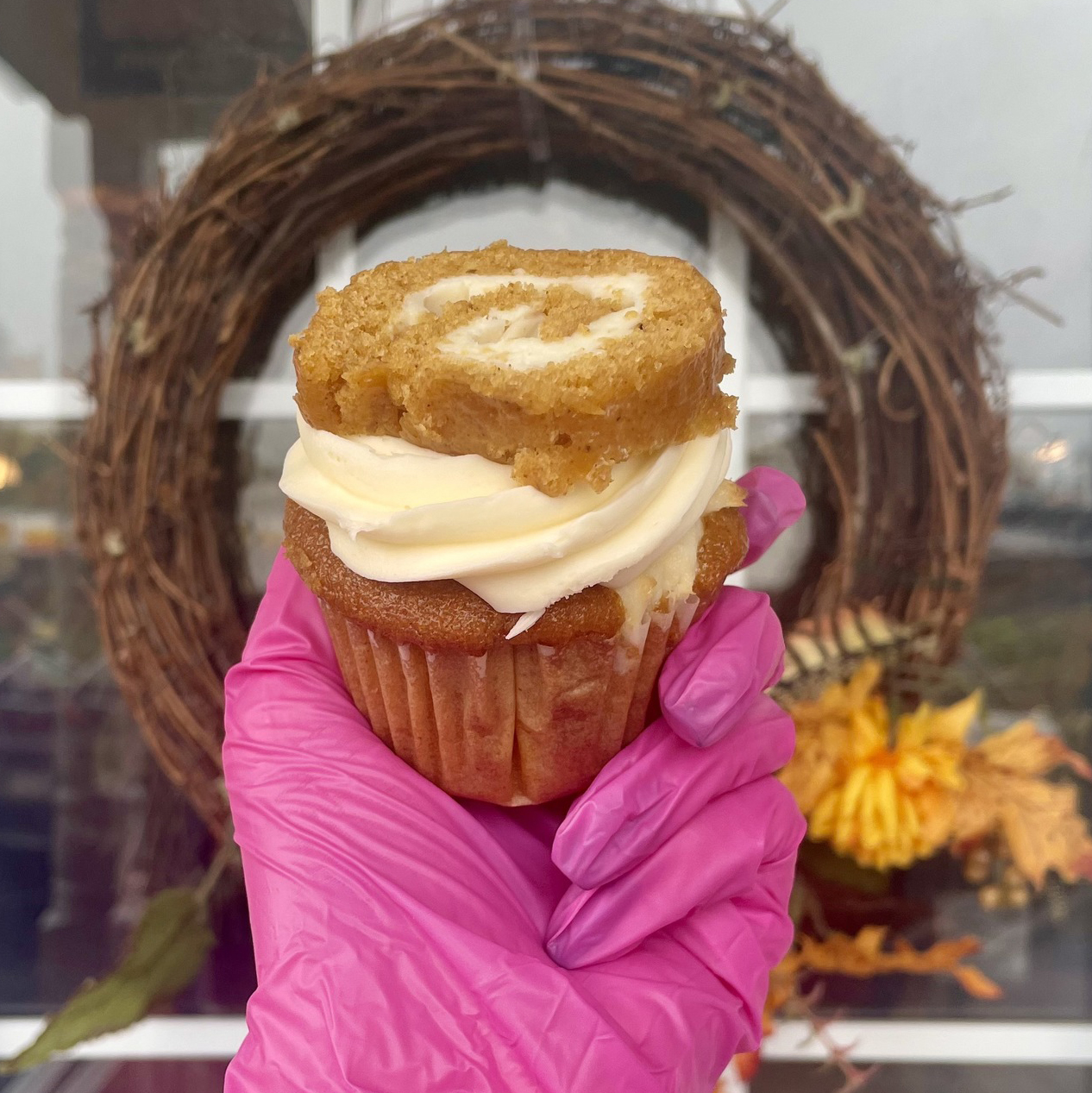 A pumpkin spice cake cupcake with cream cheese swirled into the cake, topped with a swirl of cream cheese icing, and a real mini pumpkin roll slice. An ode to one of our most famous Fall desserts!