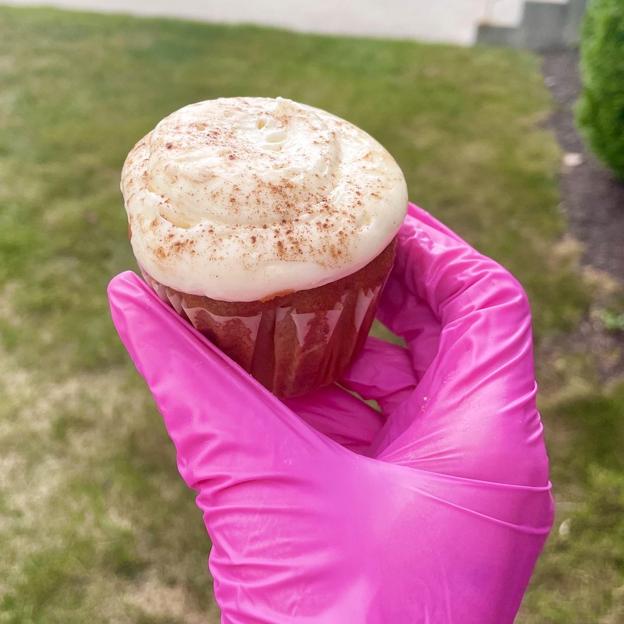 A pumpkin spice cupcake topped with a cream cheese icing and sprinkled with a dusting of cinnamon and spice.
