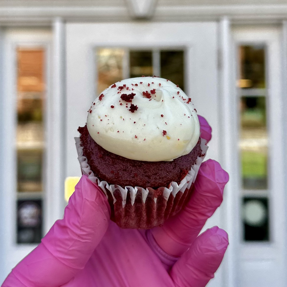 Our moist red velvet cupcake topped with a swirl of cream cheese icing.